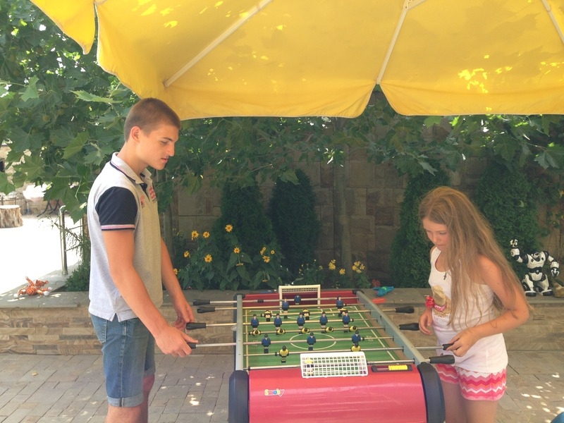 Для маленьких посетителей Simpatio оборудован специальный детский уголок, с множеством игрушек и песочницей, укрытый защитным тентом. Для более взрослых детей предусмотрены батут, настольные теннис и футбол, шахматы и нарды, бадминтон и небольшая библиотека.